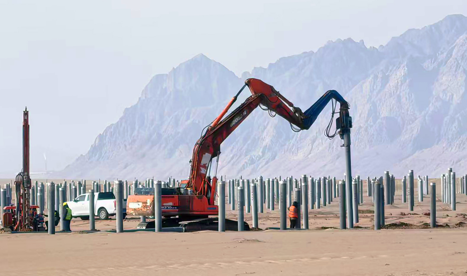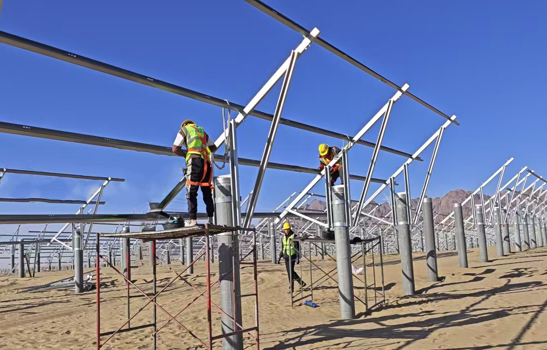 2025年6月下旬,巴彥淖爾市防沙治沙烏拉特后旗44萬千瓦光伏項目現(xiàn)場,作業(yè)人員正在分組協(xié)作,將一塊塊深藍色光伏板嵌入支架……已安裝完成的411700余塊光伏板宛如一片“藍色海洋”,在陽光照耀下熠熠生輝,與沙海形成壯觀的生態(tài)畫卷。 江西水電在烏拉特后旗以“光伏+治沙”建設(shè)模式,構(gòu)建“板上發(fā)電、板下固沙、板間種植”立體生態(tài)體系,發(fā)電場區(qū)設(shè)置草方格沙障,鋪設(shè)植生塊和種繩等生態(tài)產(chǎn)品,既提升新能源供給能力,又達到治理和修復(fù)沙漠生態(tài)環(huán)境的目的,真正實現(xiàn)以生態(tài)“含綠量”提升經(jīng)濟發(fā)展“含金量”,助力當?shù)剜l(xiāng)村振興。 戰(zhàn)高寒斗風沙 追光逐綠不打烊 2024年12月1日,項目部首批人員進場進行場區(qū)圍欄、道路施工。因項目地處陰山風口與沙漠邊緣的特殊區(qū)位,進入冬季以后,所有作業(yè)人員將面臨高寒、低溫、大風、大雪的考驗,無一人退縮,戰(zhàn)高寒斗風沙,追光逐綠不打烊,朝著工程既定目標推進工程進度。 “年關(guān)將至天氣又惡劣,導(dǎo)致現(xiàn)場作業(yè)人員嚴重不足,項目部面對極端氣候與工期壓力的雙重考驗,采取“雙班雙線”輪班作戰(zhàn)模式,不到一個半月,完成圍欄23.571千米、場區(qū)道路16.429千米、管樁施工6300余根的施工任務(wù)……”項目經(jīng)理告訴筆者,2025年元月,當?shù)仄骄鶜鉁匾呀抵亮阆?至12攝氏度,極端低溫到零下17攝氏度。項目針對極寒施工特性,構(gòu)建“三位一體”“四小時輪崗制”等保障體系,順利推進項目建設(shè)。 2025年2月15日春節(jié)后復(fù)工,為滿足工期進度,項目部增加5個打樁班組進場,23臺樁機同步作業(yè),通過“五班三倒”輪班作業(yè),25天內(nèi)完成57,328根管樁施工,創(chuàng)下日均2,293根的沙漠施工紀錄。 工程所在地,每年3月至5月處于大風及沙塵暴季期,平均風力達到3至7級,極端風力達到10級。針對沙塵頻發(fā)特性,項目部創(chuàng)新構(gòu)建“三級預(yù)警機制”“15分鐘應(yīng)急響應(yīng)圈”“三防工作法”,設(shè)置專責預(yù)報員,提前預(yù)警并做好各種預(yù)防措施,戰(zhàn)高寒,有序推進光伏支架、組件、電氣設(shè)備安裝及生態(tài)治理等作業(yè)任務(wù)。 “光伏+生態(tài)” 繪就美麗鄉(xiāng)村畫卷 遠遠望去,項目現(xiàn)場作業(yè)人員正手持鐵鍬、麥草,熟練地在沙地上編織出細密的草方格“鎧甲”,能固定流沙,還能截留雨水,構(gòu)筑起阻擋風沙的綠色防線。連綿起伏的沙丘上,無數(shù)個麥草方格就像一張金色巨網(wǎng),牢牢地鎖住了“黃龍”。 “我們二標段項目裝機容量22.88萬千瓦,總防沙治沙面積2.76萬畝,其中板下治理0.6萬畝,主要通過組件板減少蒸發(fā)、組件基礎(chǔ)固沙、板下生態(tài)種植、作物圍沙固沙等立體布局,起到生態(tài)治沙作業(yè)……” 項目總工介紹,項目建設(shè)探索出了一條“生態(tài)治理+清潔能源”的創(chuàng)新發(fā)展模式,在光伏板間及板下種植四翅濱藜、鋪設(shè)植生塊和種繩等生態(tài)產(chǎn)品,達到綠化固沙效果。同時以光伏組件為植物遮陰,減少水分蒸發(fā)量,以植物生長抑制揚沙。為類似地區(qū)的生態(tài)保護與經(jīng)濟發(fā)展提供了可借鑒的樣本,具有重要的示范推廣價值。 為確保5月四翅濱藜等苗木種植黃金期不受影響,春節(jié)復(fù)工后,項目部分批次投入近1200人、60臺機械,加快光伏支架、組件安裝等作業(yè)進度,并提前安排電氣人員進場,按區(qū)域提前完成接地及地埋電纜敷設(shè)。既避免施工過程對生態(tài)治理成果的破壞,又能充分利用光伏組件為植物遮陰的作用,提高植被成活率。 工程通過“光伏+生態(tài)”的模式,真正實現(xiàn)“板上發(fā)電、板間固沙”的立體生態(tài)治理,讓這片不毛之地蛻變?yōu)榧鍧嵞茉瓷a(chǎn)、生態(tài)修復(fù)于一體的綠色發(fā)展示范區(qū),為能源轉(zhuǎn)型樹起新標桿。站在即將改變面貌的沙漠邊緣,不難想象,在不久的將來,這里將成為一個集綠色能源與生態(tài)保護于一體的典范區(qū)域,繪就人與自然和諧共生的美麗鄉(xiāng)村畫卷。 樣板工藝引路 兵團作戰(zhàn)解難題 項目現(xiàn)場從極寒封凍到沙暴肆虐,給工程施工帶來極大的困難。項目團隊以智慧破局、用堅守作答,樣板引路,優(yōu)化施工方案、工藝,兵團作戰(zhàn),統(tǒng)籌項目建設(shè)和防沙治沙一體化推進,確保項目朝著里程碑目標推進。這段建設(shè)歷程不僅書寫了沙漠新能源工程施工的壯麗詩篇,更為類似極端環(huán)境下的大規(guī)模光伏項目建設(shè)積累了寶貴經(jīng)驗。 “工期緊,天氣惡劣的情況下,要完成管樁63648根、光伏支架15912組、組件413712塊、52陣列電氣設(shè)備、9回47.932千米集電線路等工程施工,任務(wù)十分艱巨……”項目工程部主任告訴筆者,面臨著工期緊迫、場地條件復(fù)雜及龐大的施工面積等多重考驗,對管樁、光伏支架等作業(yè)提出了極高的要求。 項目部推出工程樣板引路措施,帶動現(xiàn)場所有施工班組學習工序樣板,確保工程質(zhì)量。優(yōu)化施工工藝,利用裝載機改裝叉車進行管樁、支架及組件材料轉(zhuǎn)運,避免沙地陷車危險;運用北斗定位系統(tǒng),實現(xiàn)毫米級樁位控制;引進沙漠專用打樁引孔器,