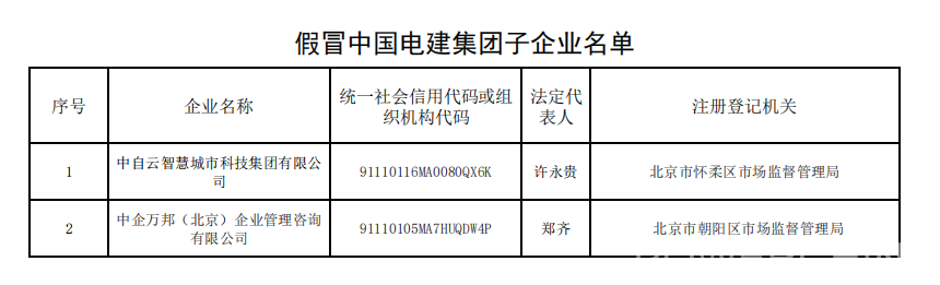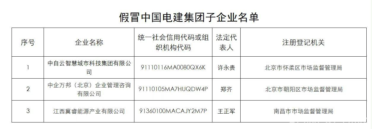 社會(huì)各界: 長(zhǎng)期以來(lái),有不法分子通過(guò)偽造相關(guān)材料等方式,將企業(yè)注冊(cè)為中國(guó)電建集團(tuán)下屬子公司,以中國(guó)電建集團(tuán)下屬子公司名義開(kāi)展業(yè)務(wù)。經(jīng)我集團(tuán)核實(shí),以下公司及其下設(shè)各級(jí)子公司均為假冒國(guó)企,與中國(guó)電建集團(tuán)無(wú)任何隸屬或股權(quán)關(guān)系,也不存在任何投資、合作、業(yè)務(wù)等關(guān)系,其一切行為均與中國(guó)電建集團(tuán)無(wú)關(guān)。請(qǐng)社會(huì)各界提高警惕,注意防范風(fēng)險(xiǎn),如發(fā)現(xiàn)其違法犯罪行為,請(qǐng)盡快到公安機(jī)關(guān)報(bào)案。 中國(guó)電力建設(shè)集團(tuán)有限公司 2023年2月16日 ? |