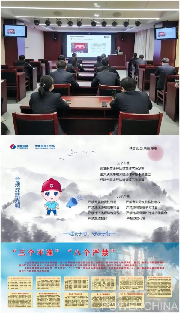 為進一步營造高質量的法治環境,構建高質量的企業管理環境,水電十二局將“三個不準、八個嚴禁”要求列為法治宣傳重點,通過組織開展“學習大講堂”、法治櫥窗、張貼宣傳海報、制作宣傳制品等方式進行宣傳,確保職工樹牢底線思維、紅線意識,真正將“三個不準、八個嚴禁”要求擺上案頭、刻在心上。